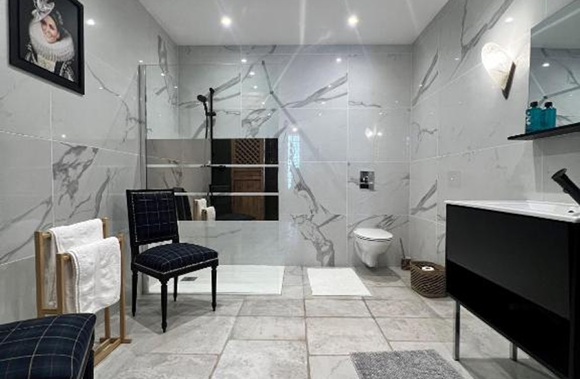 Salle de bain privative avec douche à l’italienne, barres d’appui et siège de douche